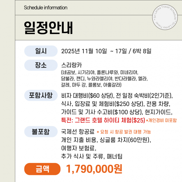 마음이 조용히 쉬어가는 곳, 스리랑카 6박 8일 (11/10 ~ 11/17) 요약정보 및 구매