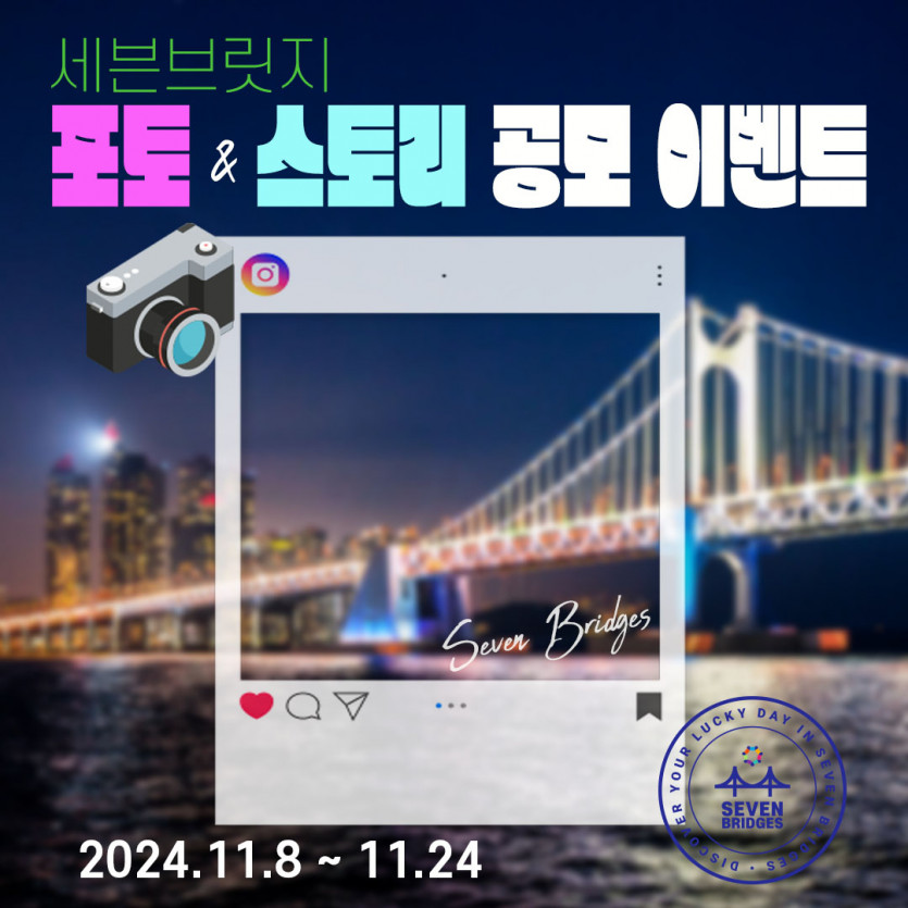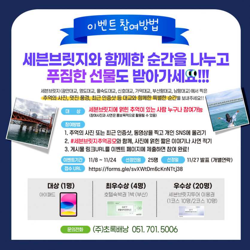 세븐브릿지 포토&스토리 공모 이벤트 페이지 정보 이벤트기간 : 2024-11-08 ~ 2024-11-24 작성일 24-11-15 15:42 본문 . 관련링크 https://forms.gle/Qqt1kvxhfDyDPjc57 284회 연결 목록 이전글2025국내보훈사적지탐방 광복80주년 대한독립원정대 '빛을 향한 여정' 25.05.07 다음글[초록배낭 8월 시네마DAY} '파일럿' 관람 이벤트 24.07.23