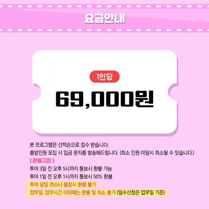 · 여행 출발일 ~1일 전 오후 1시 이후 또는 당일 취소 : 결제 금액 환불 불가