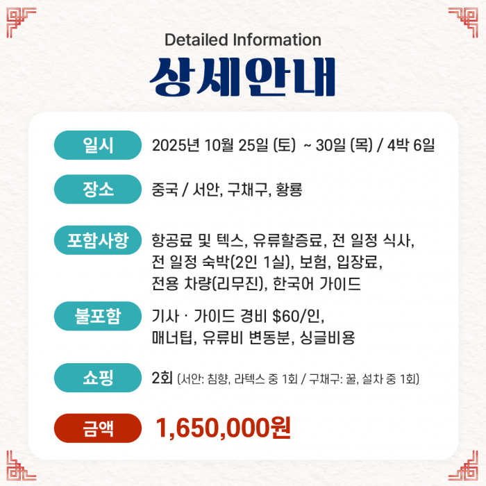 서안, 구채구, 황룡 / 4박 6일 (10/25 ~ 10/30) > 해외